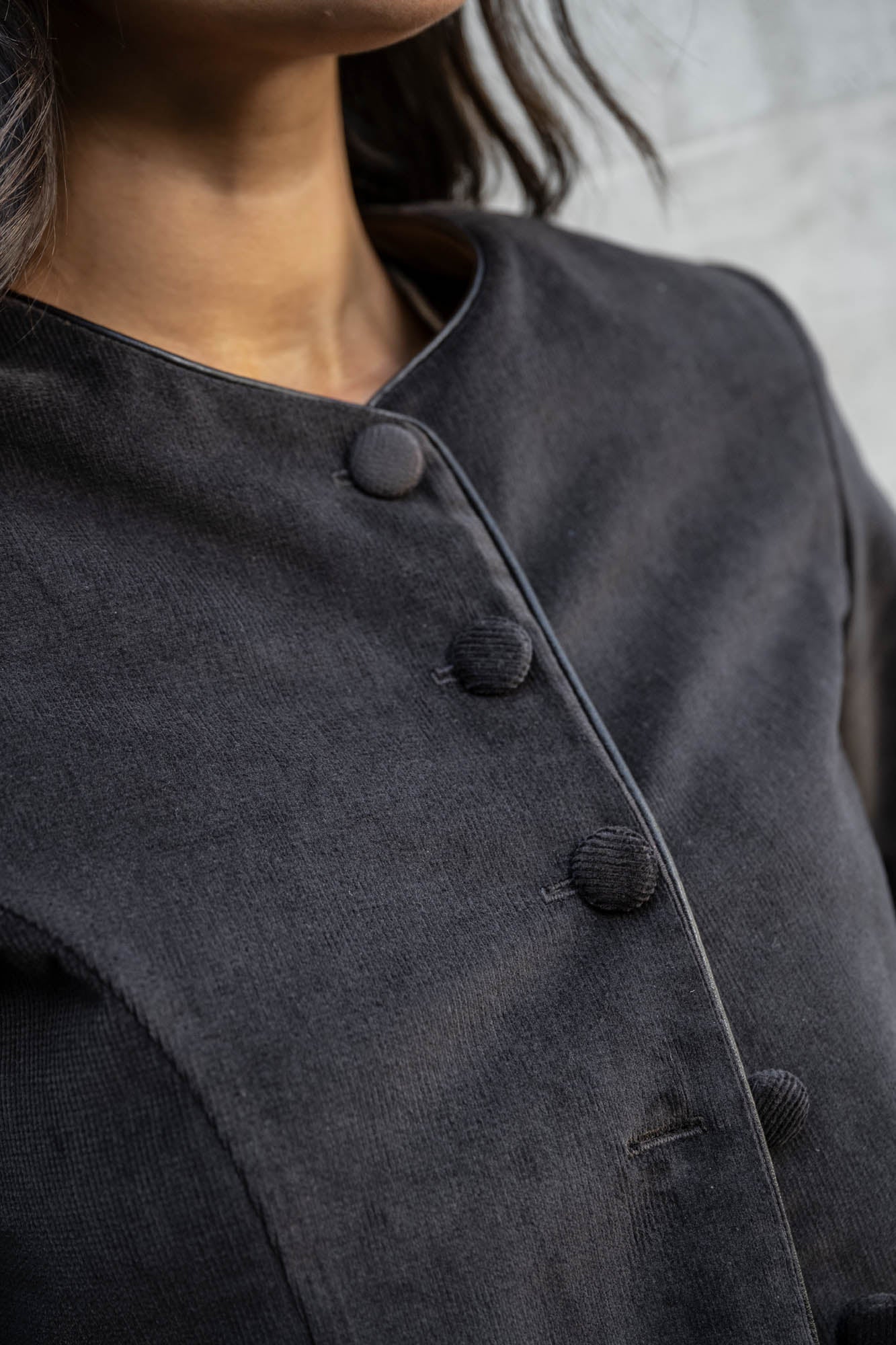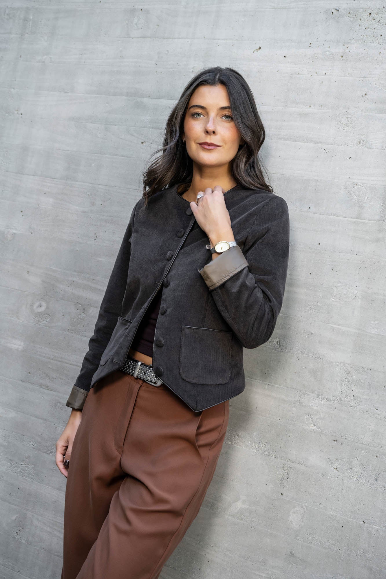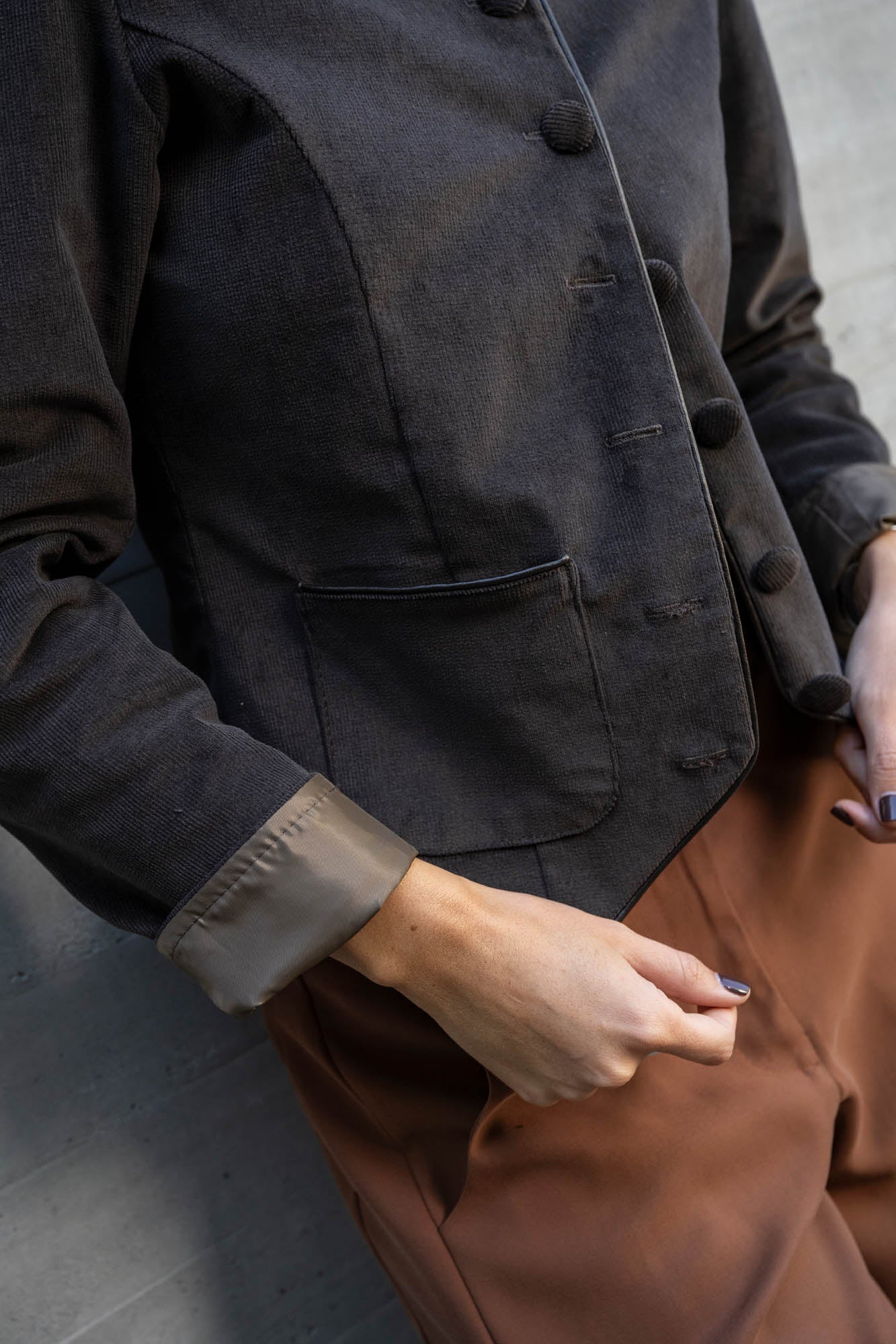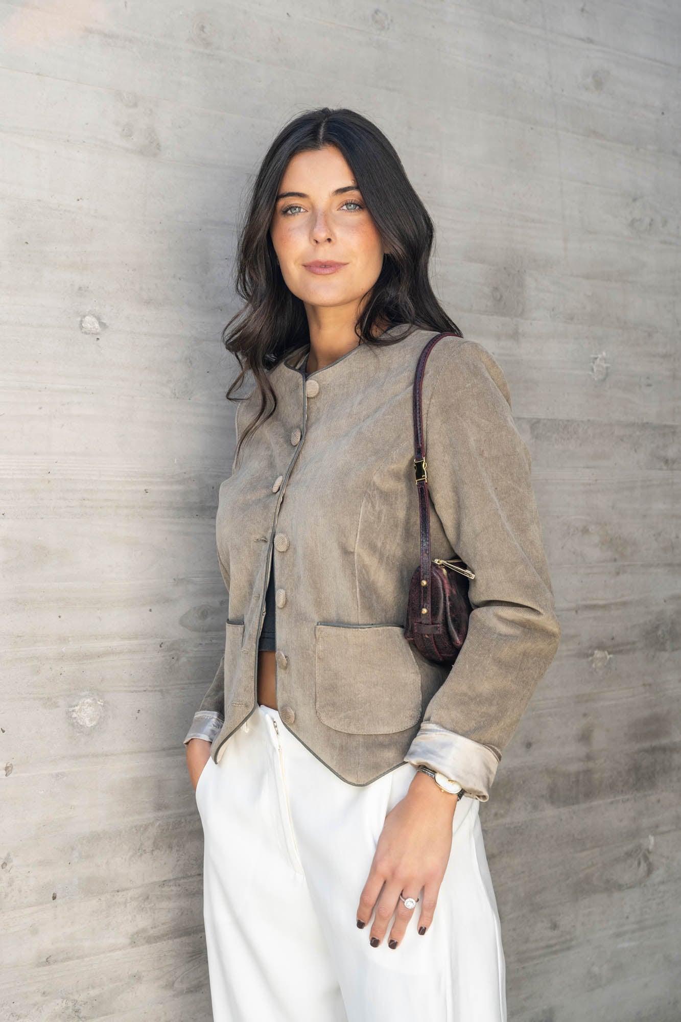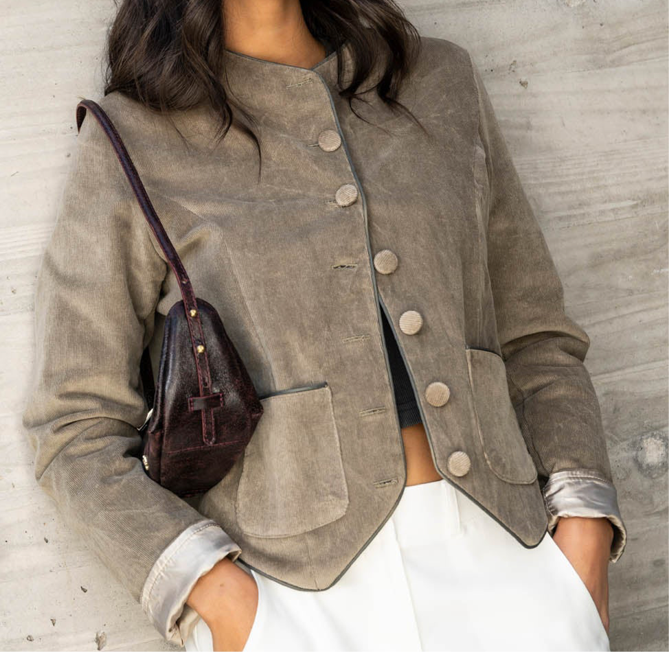 Chaqueta de cuello redondo y botones forrados en la misma tela. Vivo al tono alrededor de todo el cuerpo y bolsillos. Forro al tono.