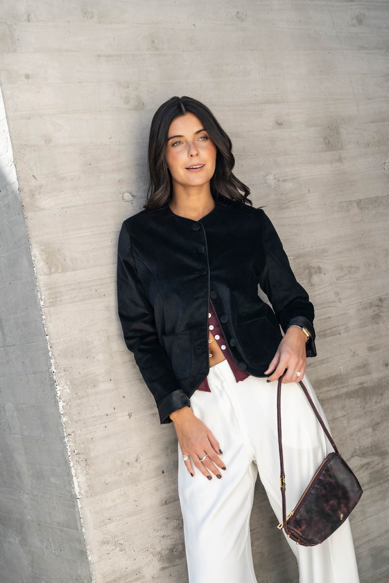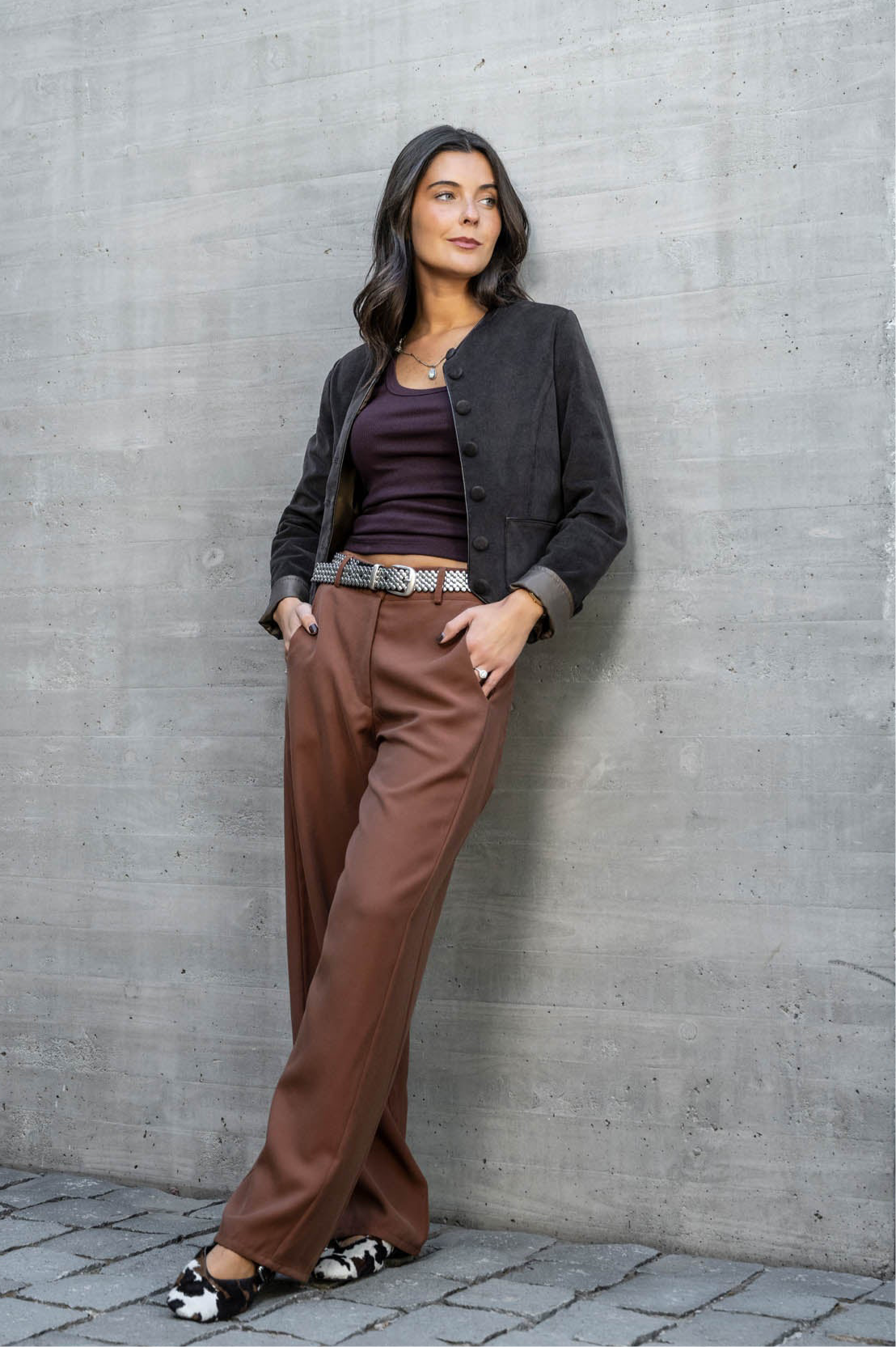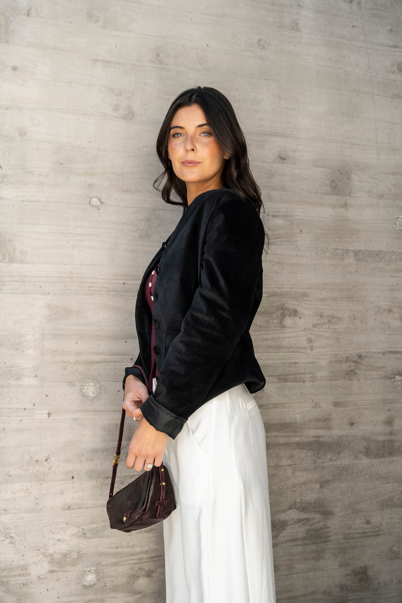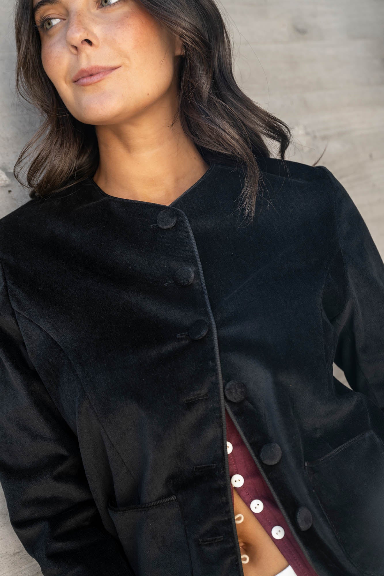 Chaqueta de cuello redondo y botones forrados en la misma tela. Vivo al tono alrededor de todo el cuerpo y bolsillos. Forro al tono.