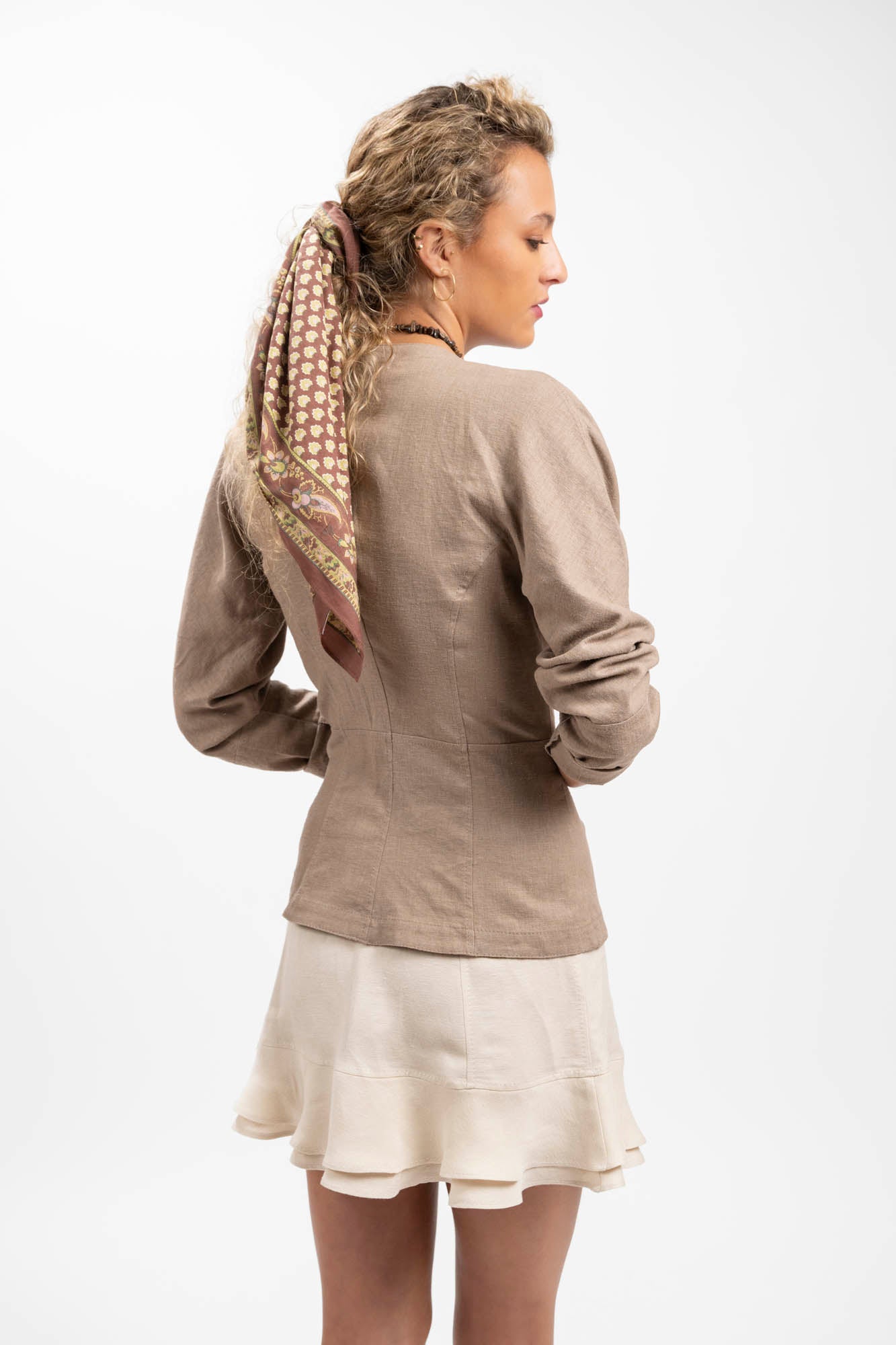 Mini de lino con cierre lateral. Ruedo de doble capa de vuelos caracol y tajo al costado con cinta en la misma tela.