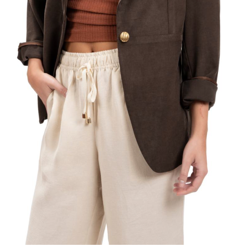 Pantalón de lino y tiro alto. Cintura elástica ajustable con cordones al tono. Pierna ancha.