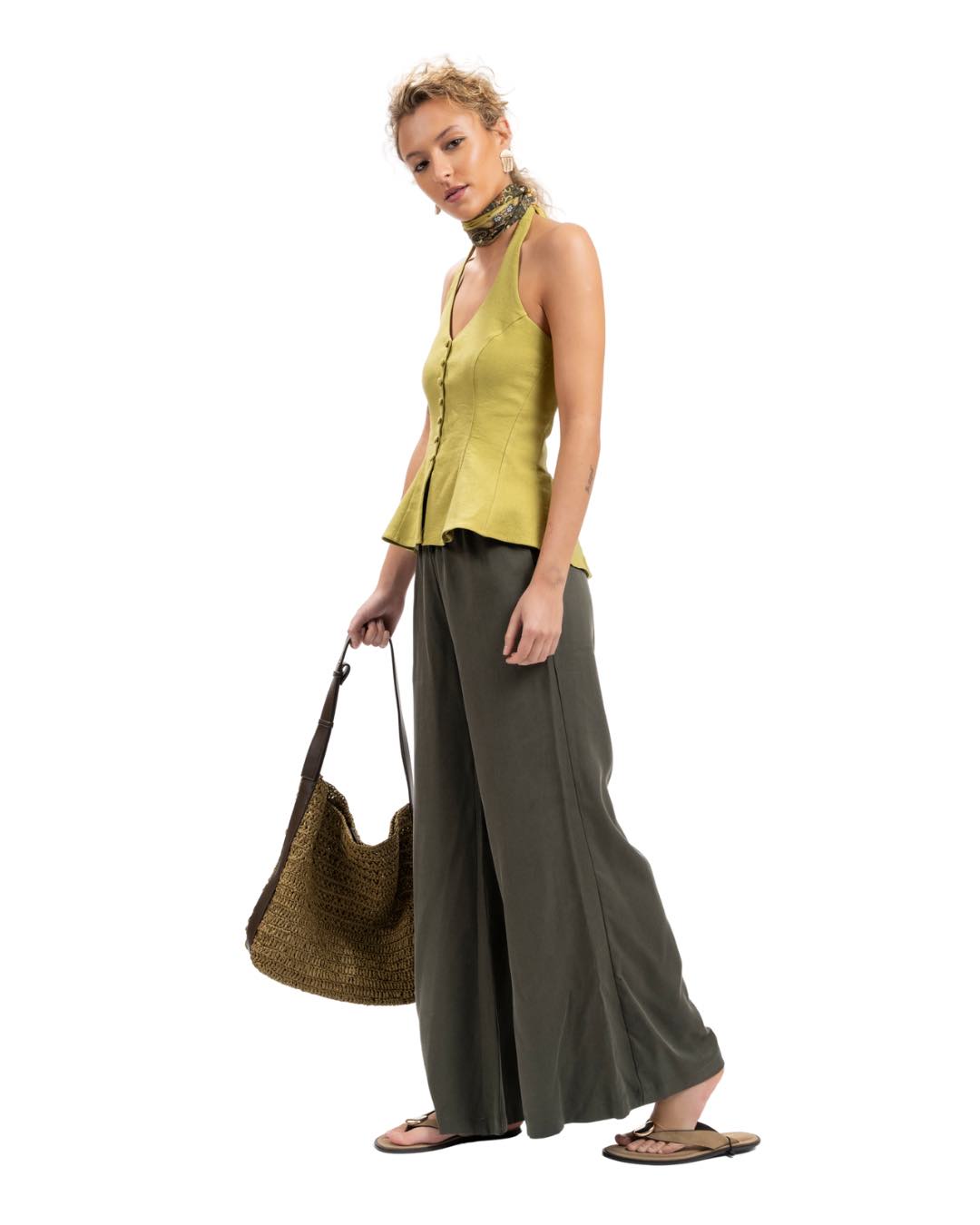 Top de lino con amarra arriba y escote en V. Botones forrados al tono y vuelo en la parte inferior. Elástico en la parte de atrás, lo que da una mayor amplitud a la prenda.