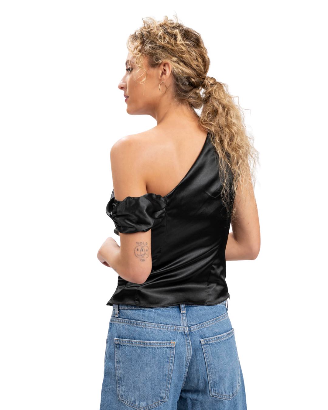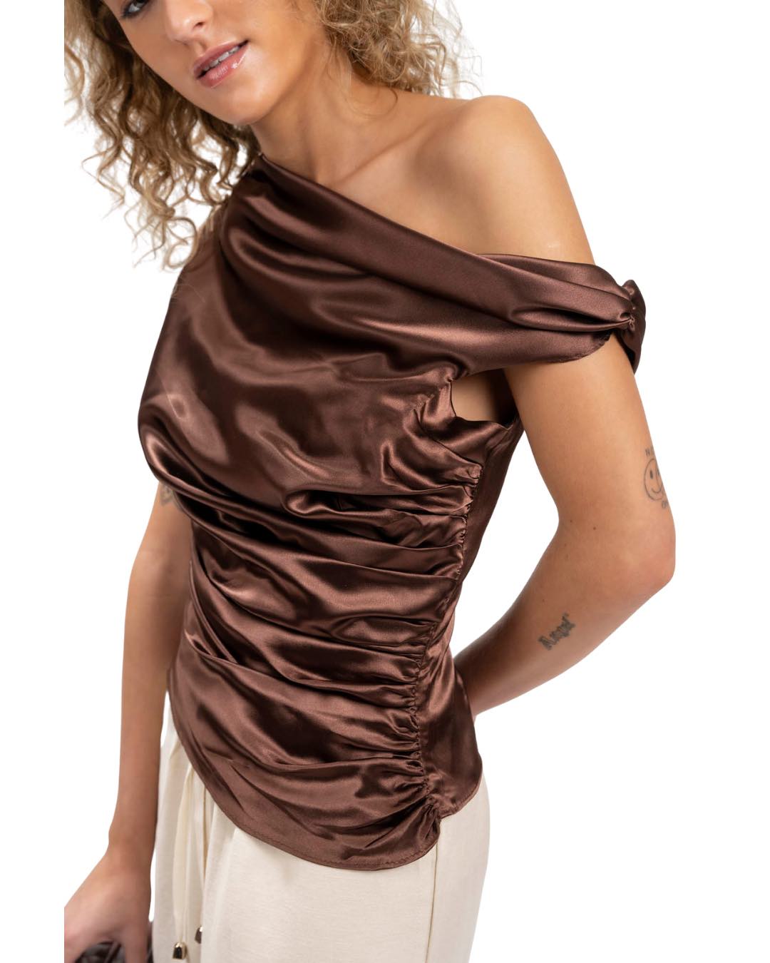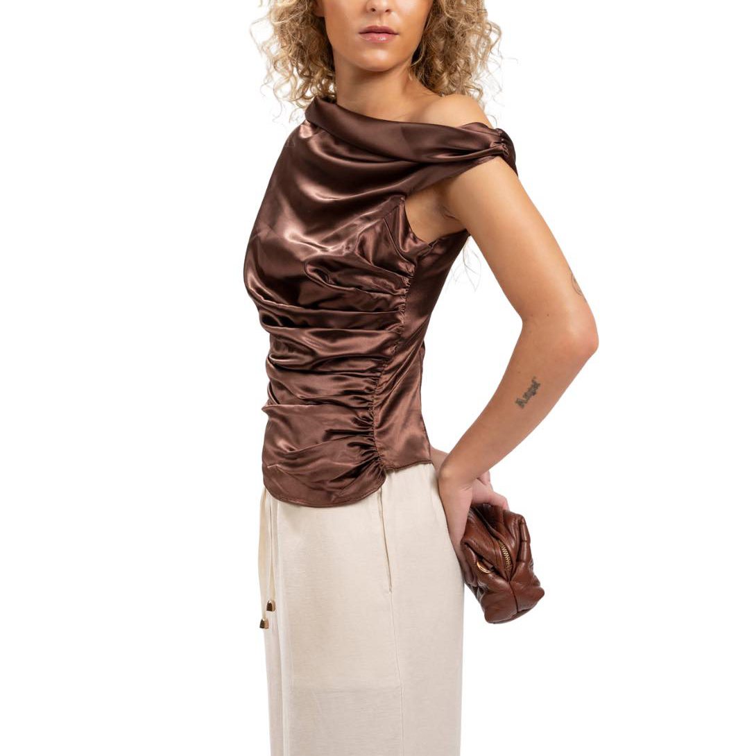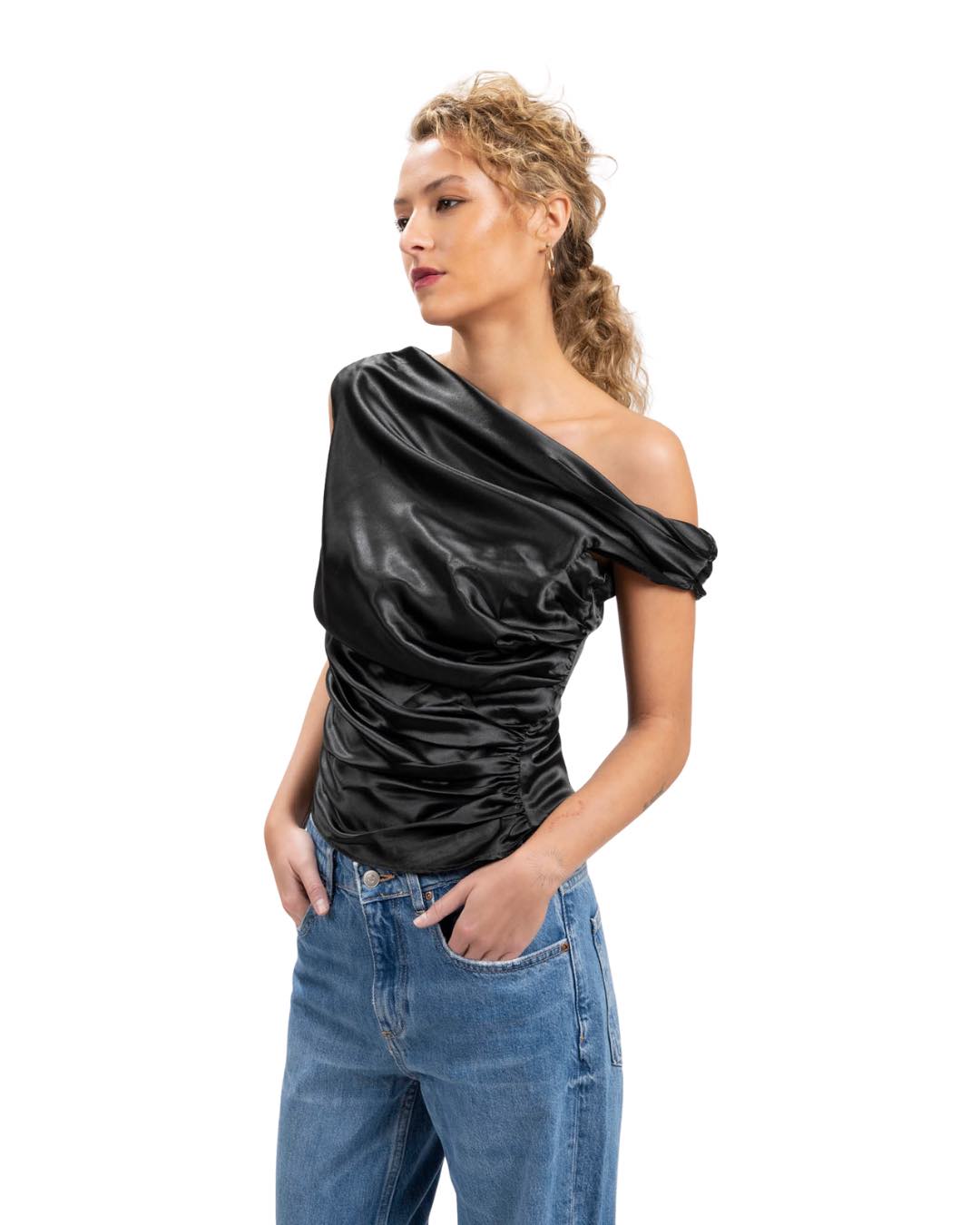 Top de crep seda plisado y ajustado al cuerpo con una manga caída. Con cierre lateral y forro interno.